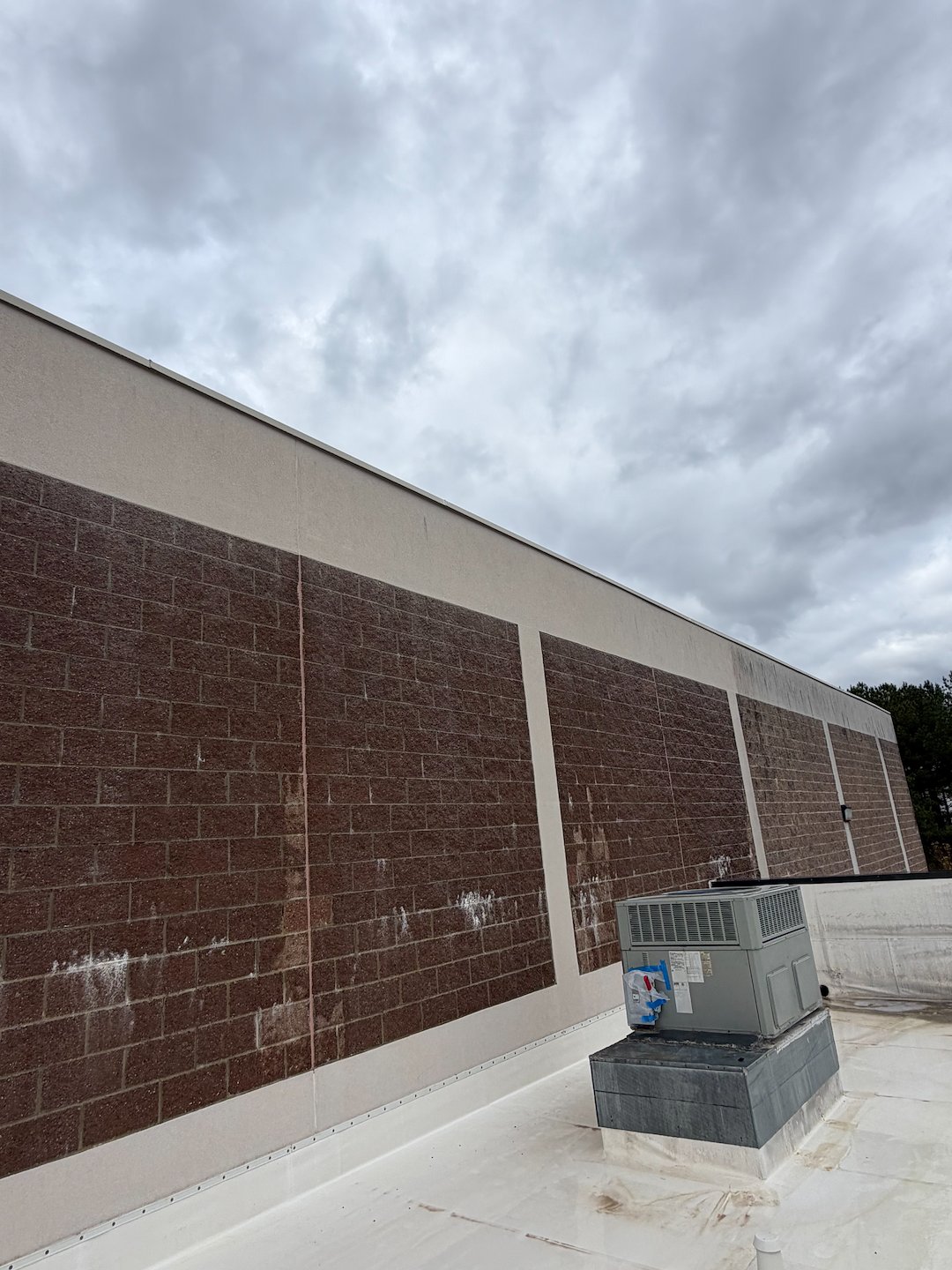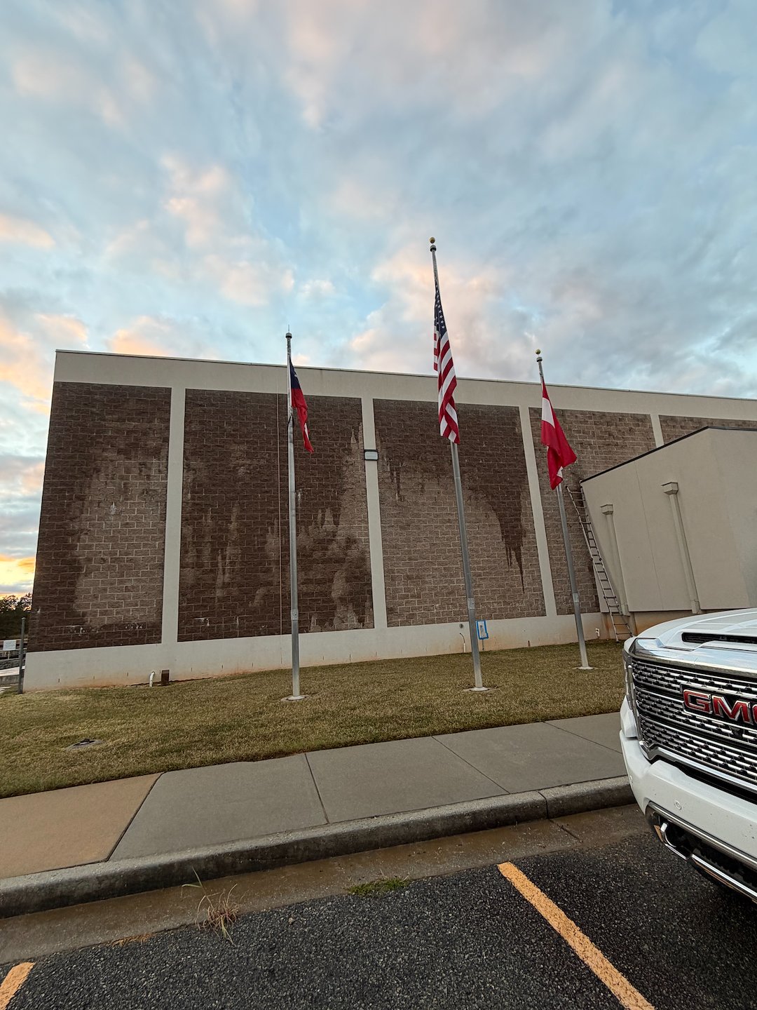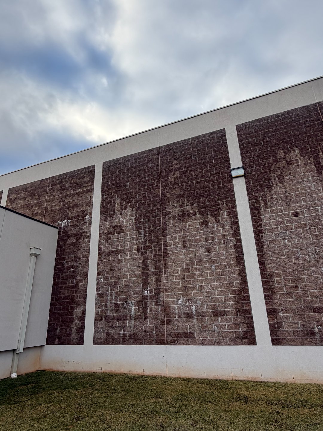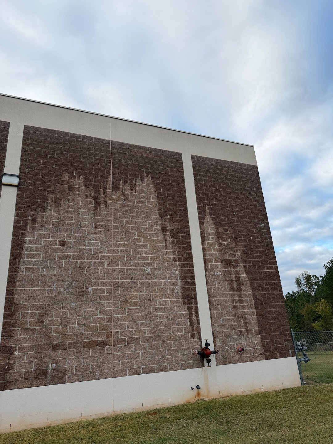 For the building exterior, the crew relied on a chemical-based softwash method. Softwashing uses cleaning solutions applied at low pressure to safely lift away grime and biological growth without risking damage to paint, trim, or sensitive surfaces. Because the method is chemical-based, it reaches into porous surfaces and helps prevent rapid re-growth of algae and mildew that regular rinsing alone does not address.