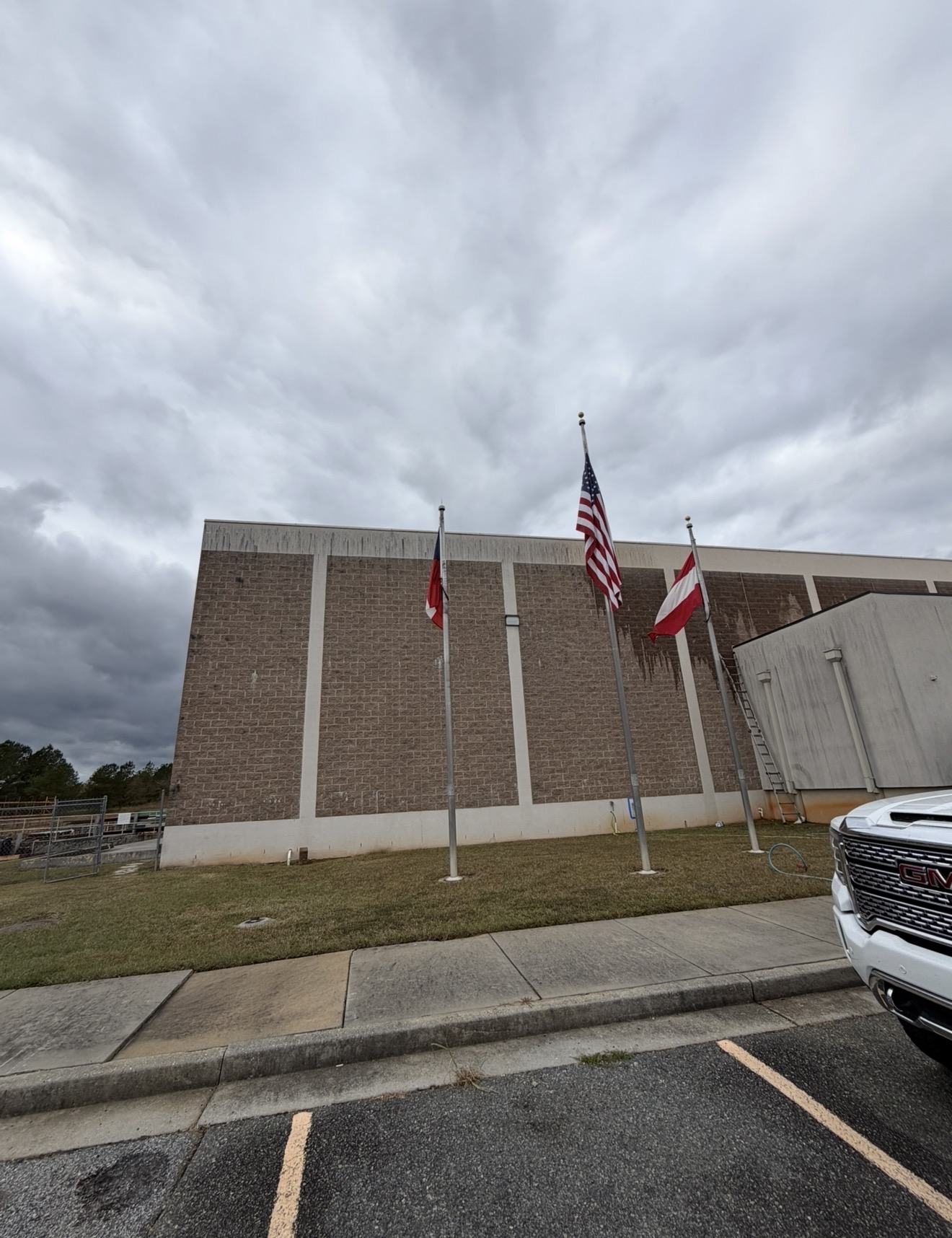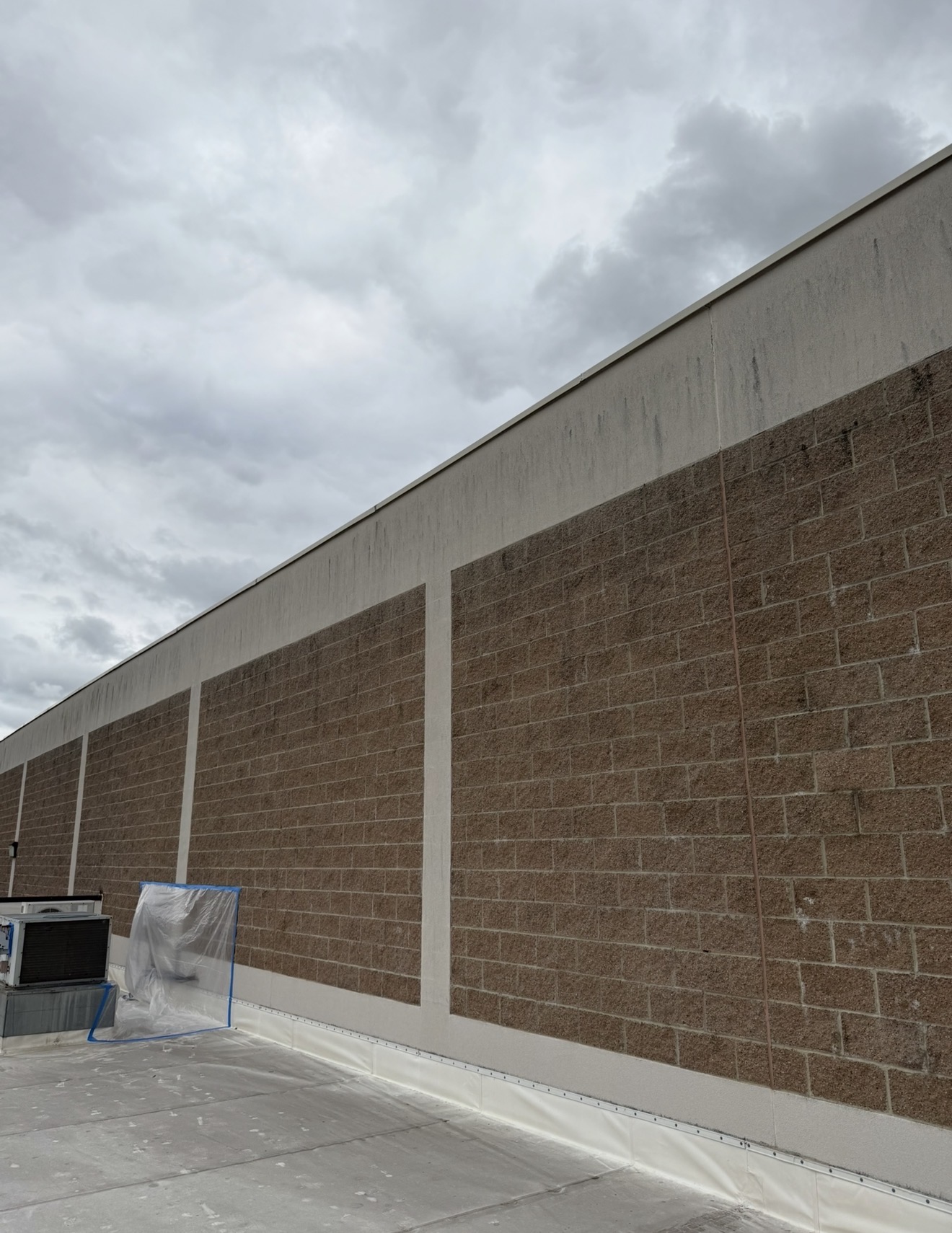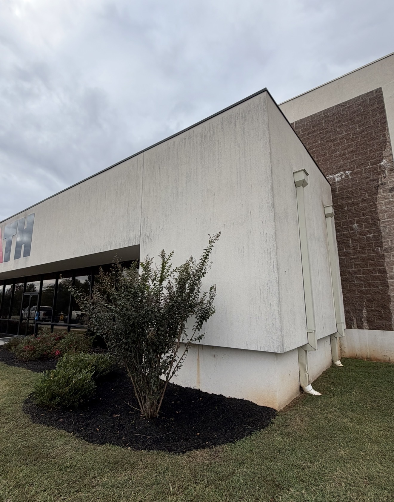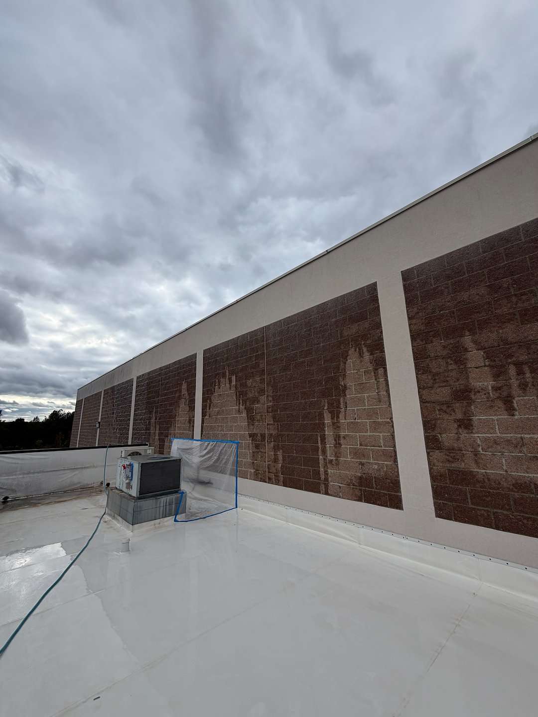 For the building exterior, the crew relied on a chemical-based softwash method. Softwashing uses cleaning solutions applied at low pressure to safely lift away grime and biological growth without risking damage to paint, trim, or sensitive surfaces. Because the method is chemical-based, it reaches into porous surfaces and helps prevent rapid re-growth of algae and mildew that regular rinsing alone does not address.