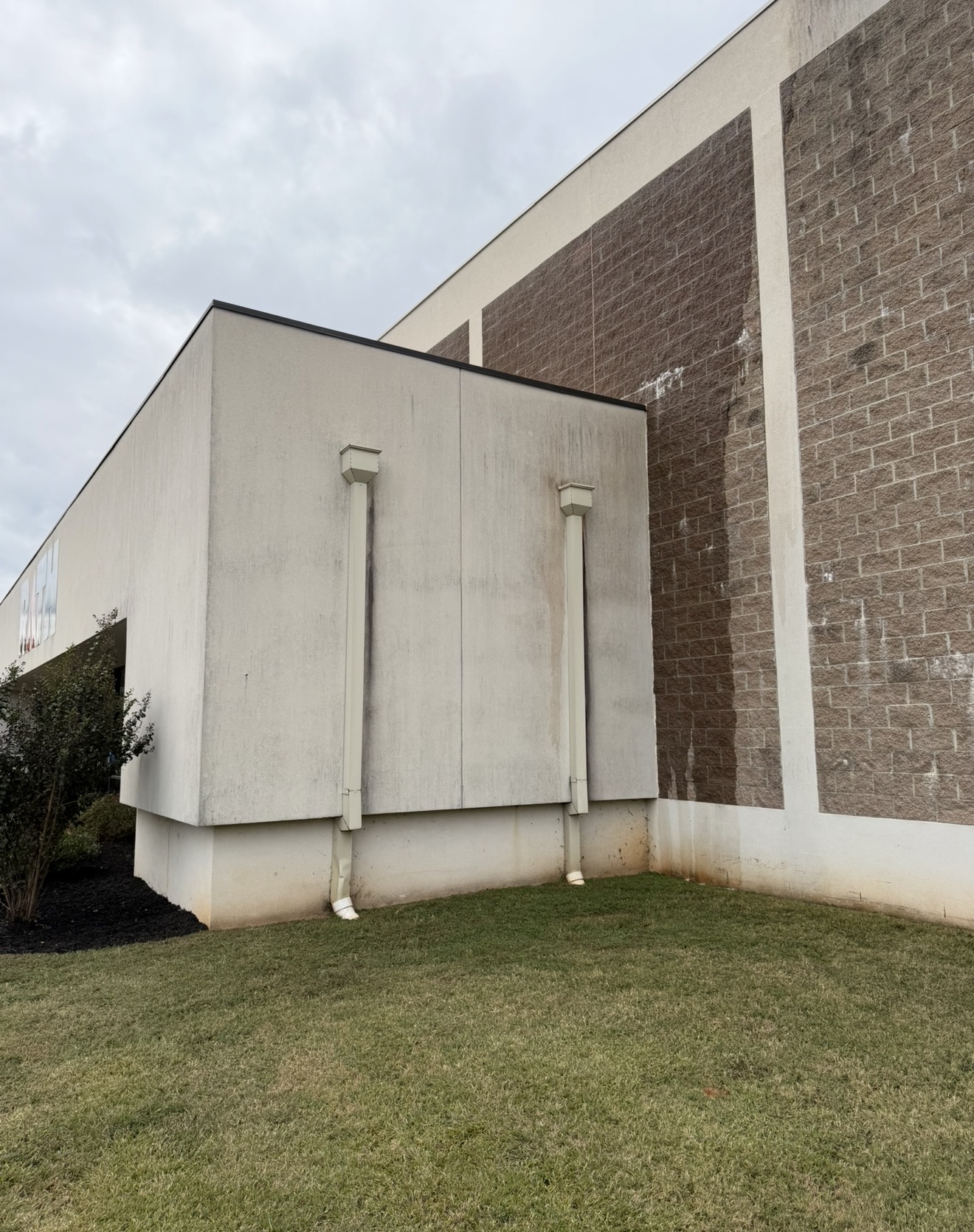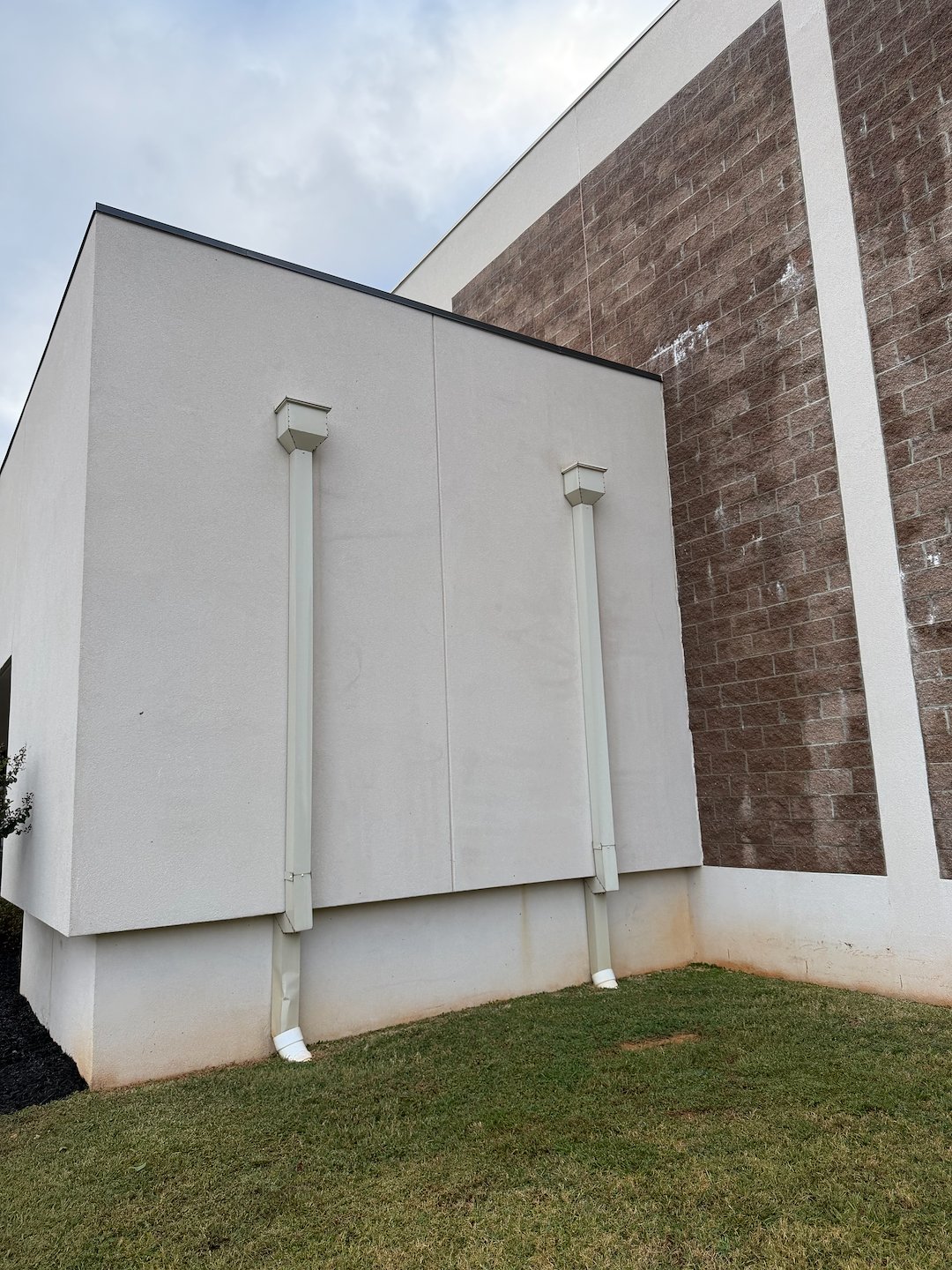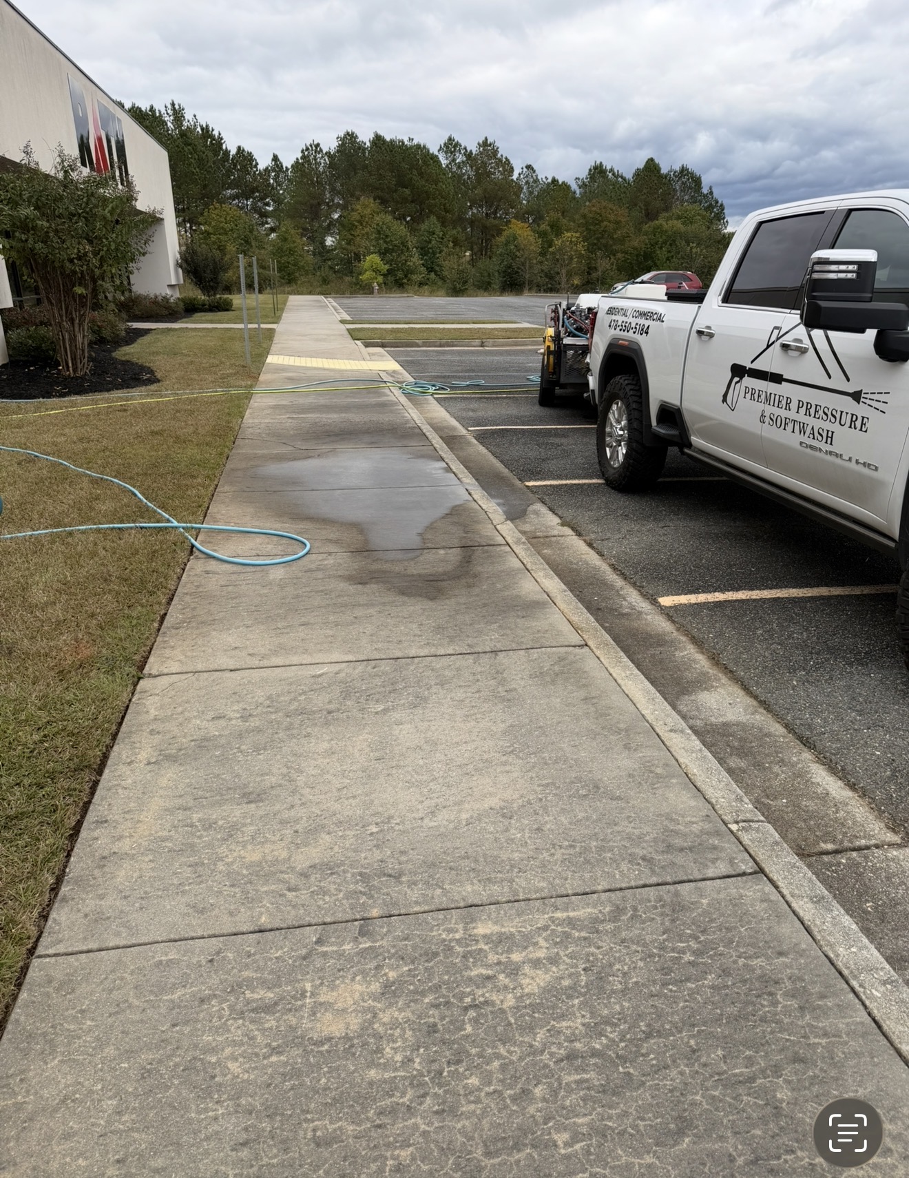Premier Pressure and Softwash completed a storefront cleaning project in Milledgeville, GA, using a softwash-first approach for the building and a combined softwash and pressure wash method for the front sidewalk. The team focused on removing visible dirt, biological growth, and algae that had accumulated on the building facade and on the pedestrian pathway.