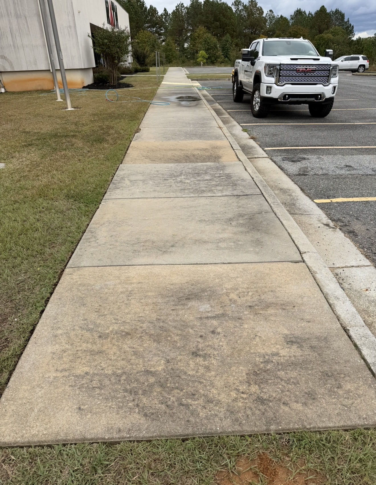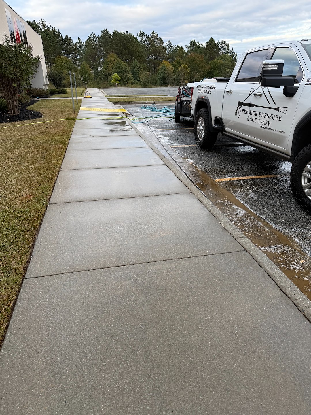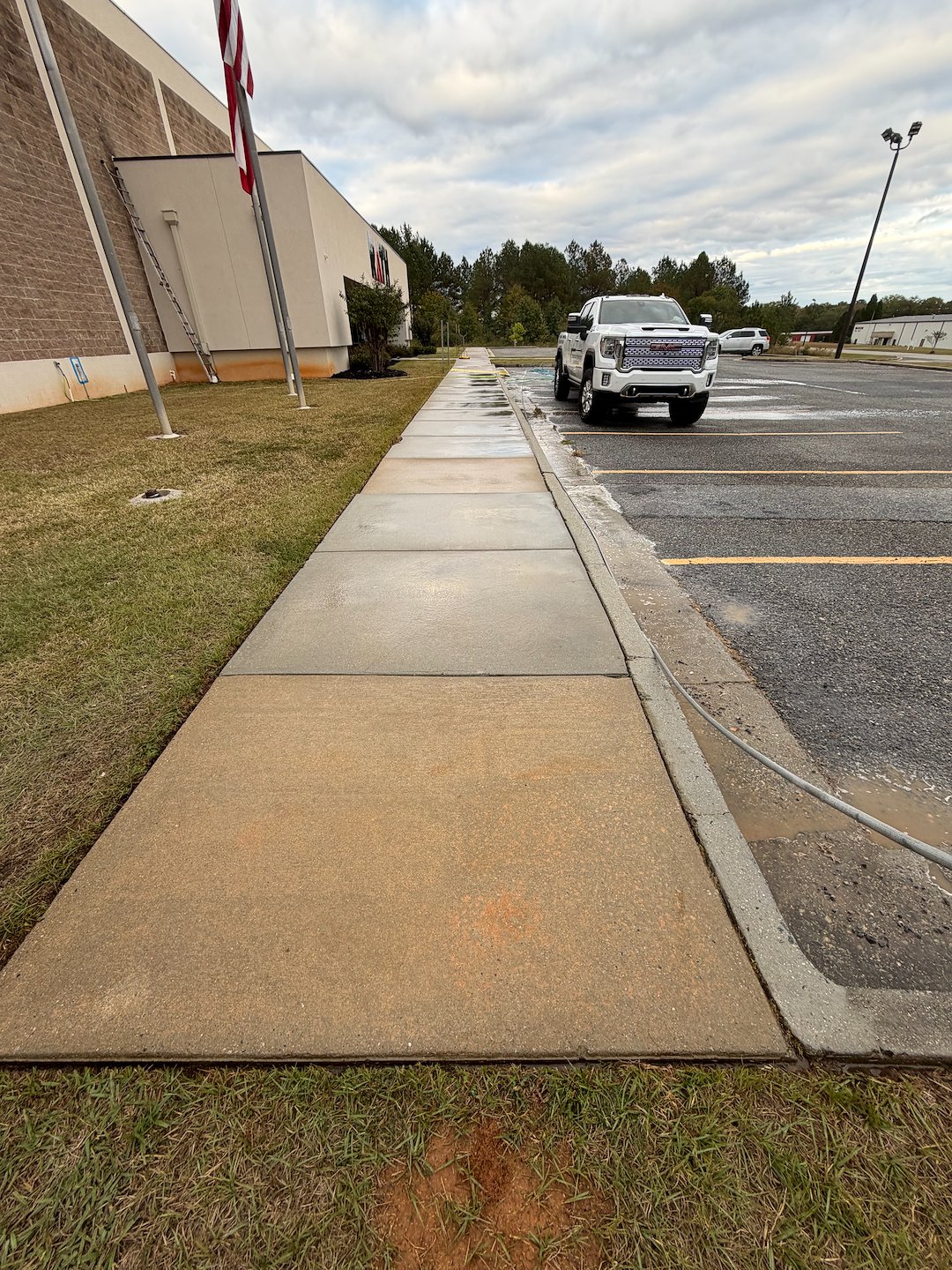 Using both softwash and pressure wash on the sidewalk balances safety and effectiveness. The softwash breaks down and sanitizes the biological growth, while the pressure wash removes the residue and restores the concrete’s appearance. This two-step approach is especially useful on surfaces that see foot traffic and need a thorough rinse to remove slippery algae.